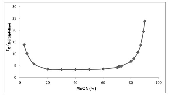 上图为乙腈浓度对去甲替林保留时间的影响,当流动相中有机相浓度增加时,去甲替林的保留时间逐渐减小,表现出反相色谱保留机理;随着流动相中有机相浓度继续增加,去甲替林保留时间减小到一极值点后开始逐渐增加,此时表现出正相色谱保留机理。该实验表明Inspire HILIC色谱柱同时具有正相和反相色谱分离的能力,能够同时分析分离不同极性化合物的混合物。