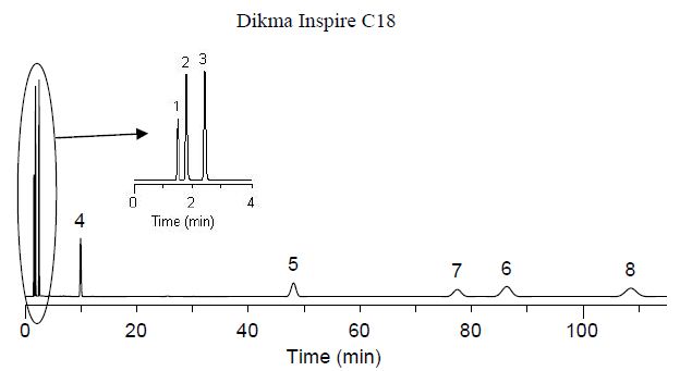 色谱柱 如图所示 规格 150 4.6 mm, 5 μm 流动相 甲醇/水 = 65/35 流速 1.0 ml/min 温度 室温 检测器 UV 254 nm 样品 1. 尿嘧啶 5. 丁基苯 2. 咖啡因 6. 戊基苯 3. 苯酚 7. 邻三联苯 4. 甲苯 8. 苯并菲 |