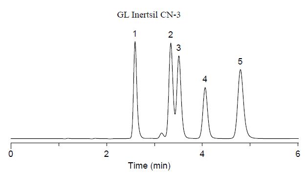 正相 色谱柱: Platisil CN, 150 x 4.6 mm, 5 μm 流动相: 正己烷:甲醇 = 95:5 流速: 1.0 ml/min 柱温: 室温 检测器: UV 254 nm 样品: 1. 邻苯二甲酸二辛酯 2. 邻苯二甲酸二丁酯 3. 邻苯二甲酸二丙酯 4. 邻苯二甲酸二乙酯 5. 邻苯二甲酸二甲酯 | |