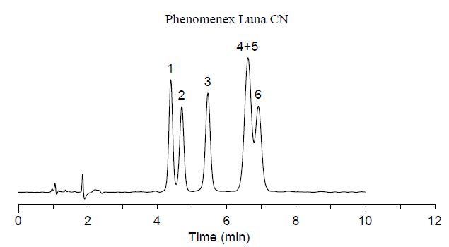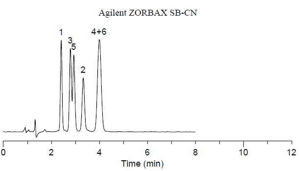 色谱柱 如图所示 规格 150 x 4.6 mm, 5 μm 流动相 己烷/乙醇 = 90/10 流速 2.0 ml/min 温度 室温 检测器 UV 254 nm 样品 1. 11-酮孕甾酮 2. 醋酸泼尼松龙 3. 皮质酮 4. 泼尼松龙 5. 可的松 6. 地塞米松 | |
