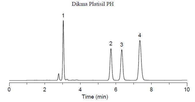 Platisil PH柱适用于反相色谱模式下芳环类化合物和极性化合物的分离,其保留特性类似于反相C8柱,但疏水性更弱一些。由于表面苯基基团的双键作用(π-π键相互作用),使其具有独特的选择性,能够拓宽色谱应用的范围,方便色谱工作者方法的选择和开发。此外,Platisil PH柱采用了高密度键合和独有的封端技术,使得柱子的稳定性和寿命大大增加。