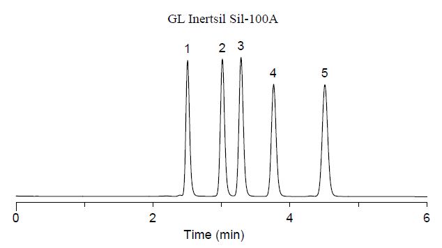 色谱柱 如图所示 规格 150 x 4.6 mm, 5 μm 流动相 A相:正己烷 B相:二氯甲烷:甲醇 = 80:20 A:B = 95:5 流速 1.0 mL/min 温度 室温 检测器 UV 254 nm 样品 1. 邻苯二甲酸二辛酯 2. 邻苯二甲酸二丁酯 3. 邻苯二甲酸二丙酯 4. 邻苯二甲酸二乙酯 5. 邻苯二甲酸二甲酯 |