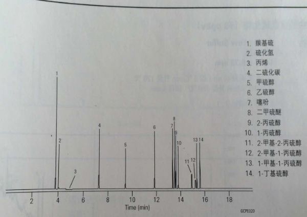 因为组分较多,建议使用毛细管色谱柱进行分离,建议选择长度较长的大口径(0.53mm)PLOT-Q 或DB-1 毛细管色谱柱,使用FPD检测器进行分析。 如使用填充柱,porapakQ 系列填料与Plot Q 等同,但由于填充色谱柱口径较大,柱长较短,理论塔板数不足,很有可能导致部分组分无法分离。