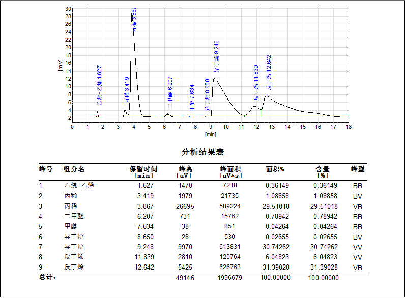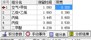 你这张是分析甲醇 二甲醚的谱图,因为柱子的为题,其他峰是分不开的,如果想分析液化气的组成,可换个柱子。带宽其实就是指的保留时间加减带宽的时间内出的峰就是最开始定性的峰。