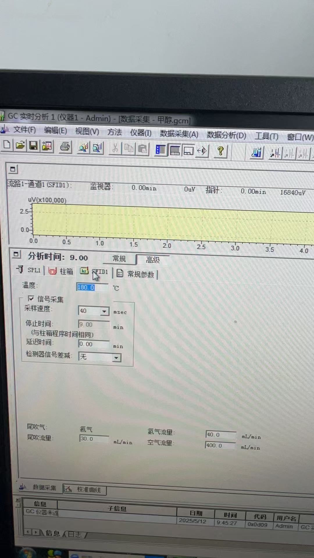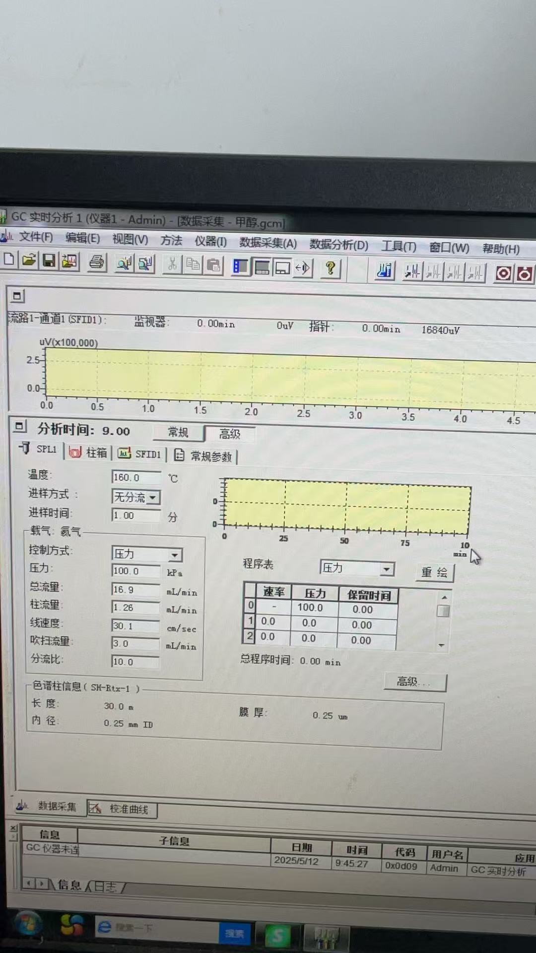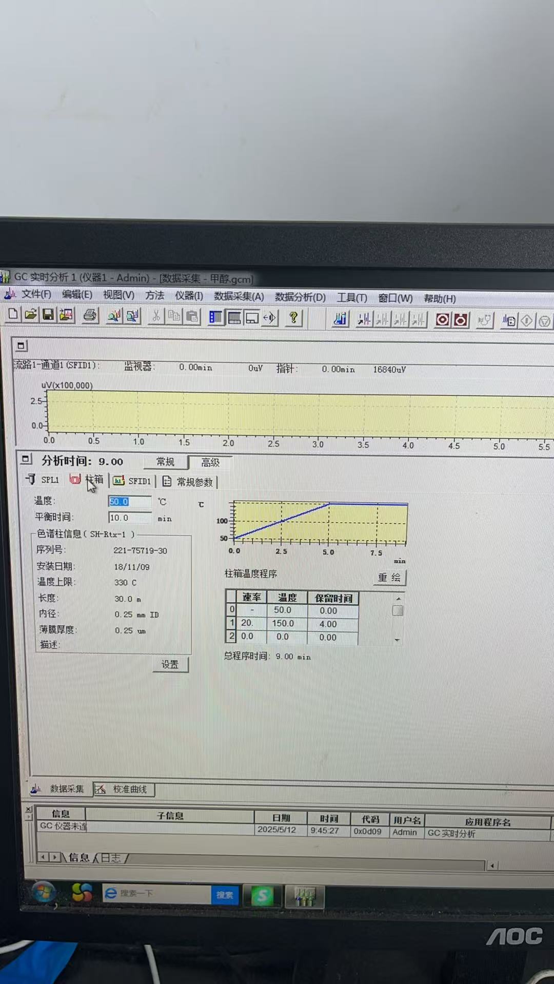 温度太高了,甲烷肯定跑在甲醇前面,你首先考虑应该把甲醇保留住,64沸点的甲醇你50°C的柱箱不直接跑了?越低越好