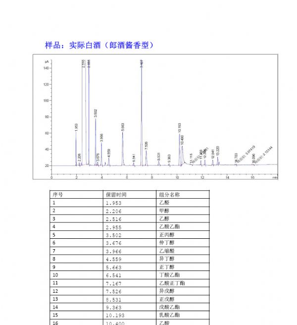 用WAX或FFAP聚乙二醇类强极性毛细管柱分析白酒,乙酸乙酯和甲醇的确是难分离对峰出在乙醇前面而且乙酸乙酯和乙缩醛根本就分不开,东立龙LZP930或其它一些厂家的白酒专用柱针对性的解决了这些问题,在这些色谱柱上甲醇在乙醇前面出峰,乙酸乙酯和乙缩醛峰出在了乙醇后面而且和其它组分完全分开。特别是一种白酒快速分析柱,出峰的顺序前面完全和DNP填充柱一样,而且程序升温后乙酸等有机酸也能尽数出峰,β-苯乙醇也可以出峰,白酒大多数主要香味可以完全分离开。