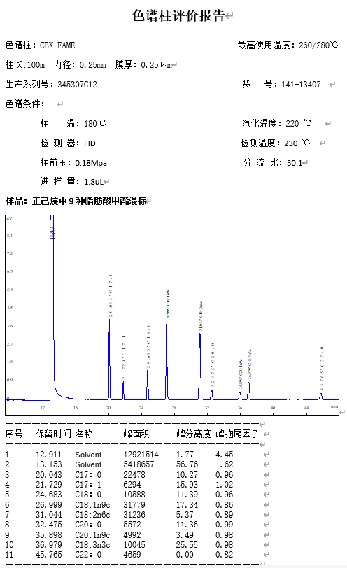 常用于顺/反 FAME 专用分析 温度稳定范围达 260°C
