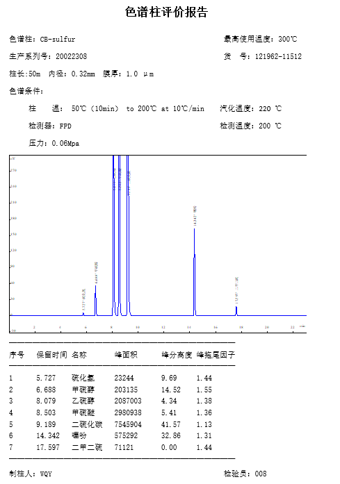 是一种厚膜的专用柱,专用于烃类样品中的挥发性硫化物分析,如LPG中的硫化氢,羰基硫,甲硫醇,乙硫醇和噻吩等化合物