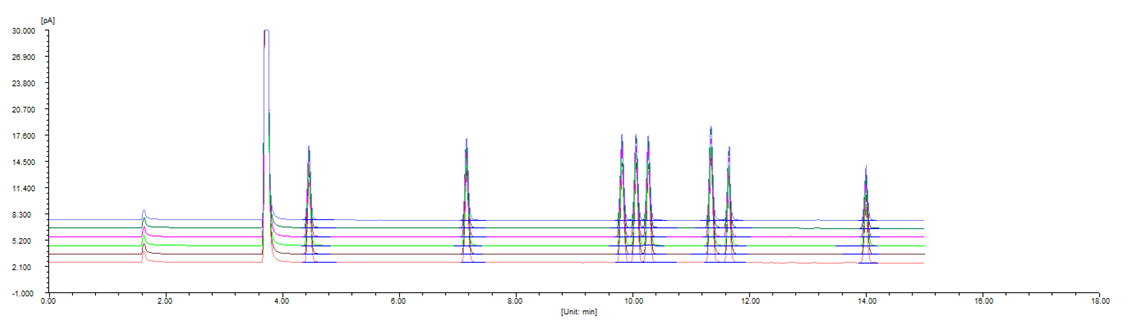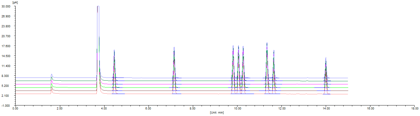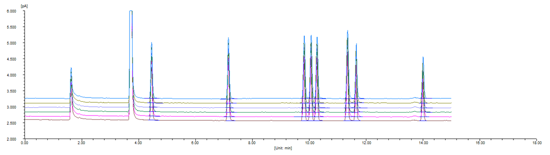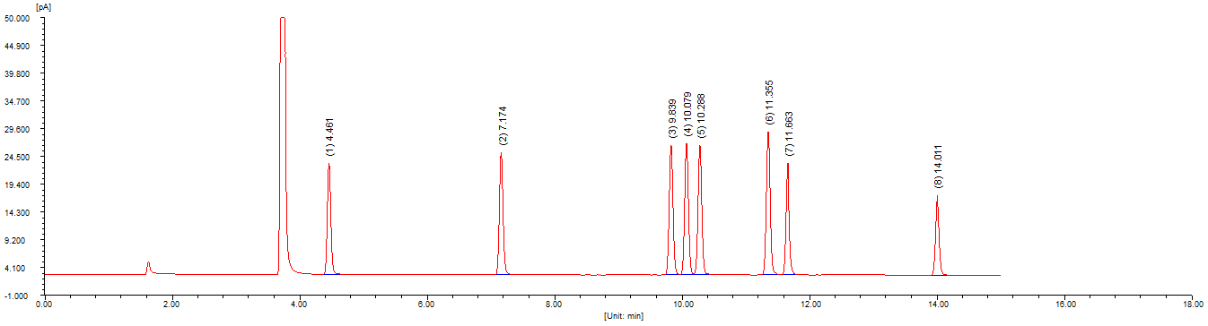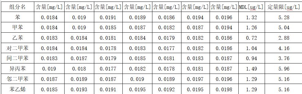 苯系物(0.1mg/L)标准溶液在RBX-WAX上的重复性谱图及数据