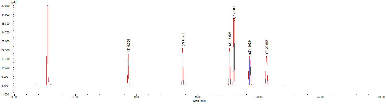 苯系物(0.02mg/L)标准溶液在RBX-WAX上的重复性谱图及数据