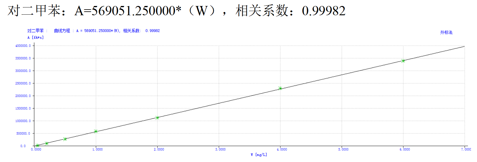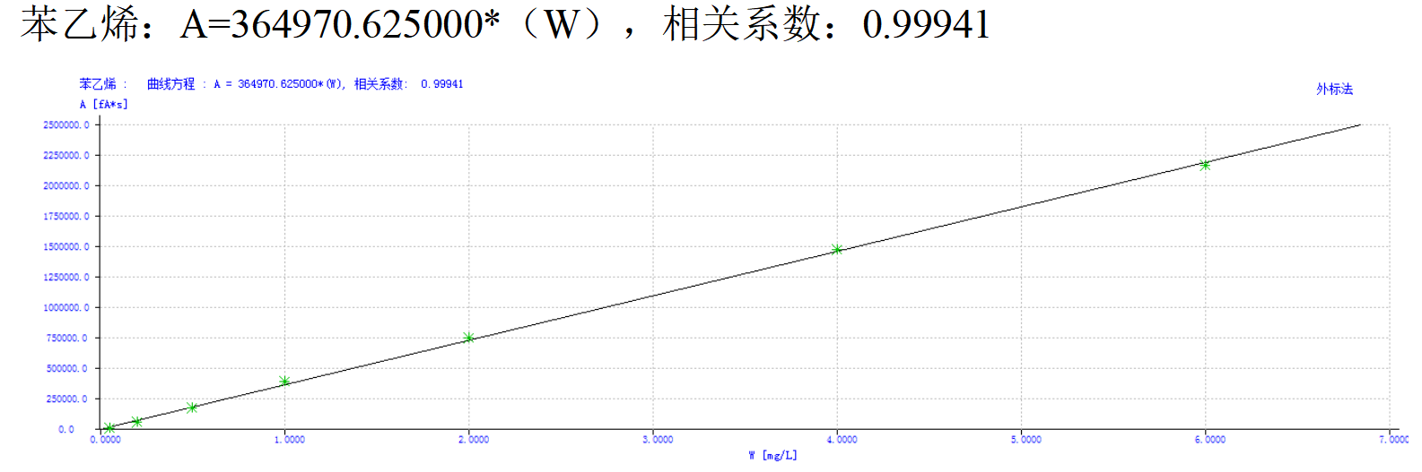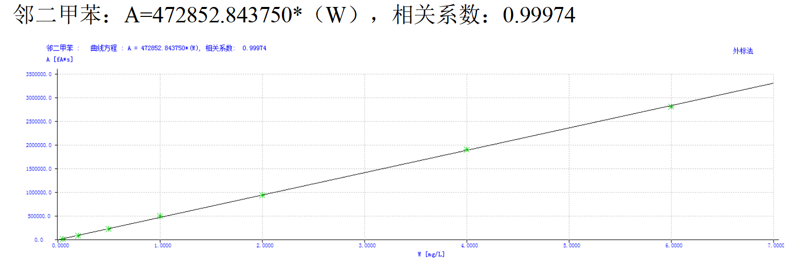 在一定的温度下,顶空瓶内水样中的苯系物向液上空间挥发,在气液两相达到热力学动态平衡。气相中的苯系物经气相色谱分离,用氢火焰检测器检测,以保留时间定性,外标法定量,各组分的线性相关系数为0.99941-0.99991。