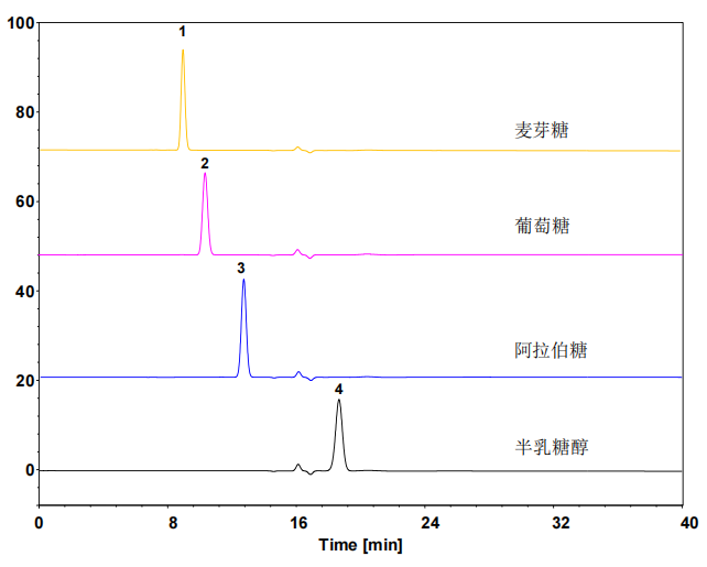 麦芽糖、葡萄糖、阿拉伯糖、半乳糖醇在ChromCore Sugar-10Ca色谱柱上的分离