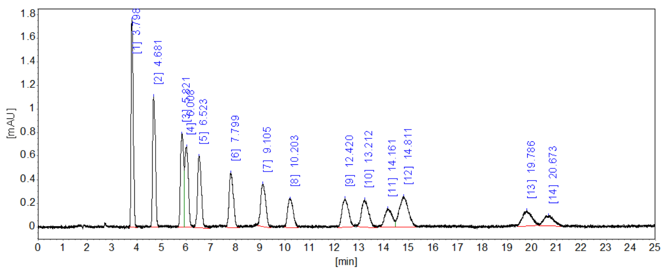 通过醛、酮类-DNPH标准溶液,考察LC5090系统灵敏度、重复性、线性等指标。