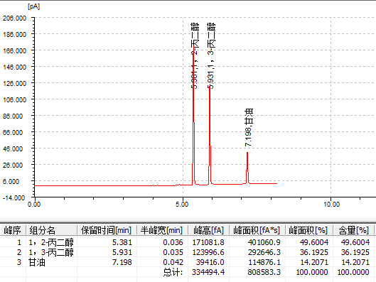 样品1:甘油,1,3-丙二醇,1,2-丙二醇混合后用水稀释