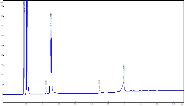 色谱柱:CB-A202 规格:30m×0.32mm×0.33 um 最高使用温度:280℃色谱条件:柱温:130℃ 汽化温度:220 ℃ 检测温度:230 ℃