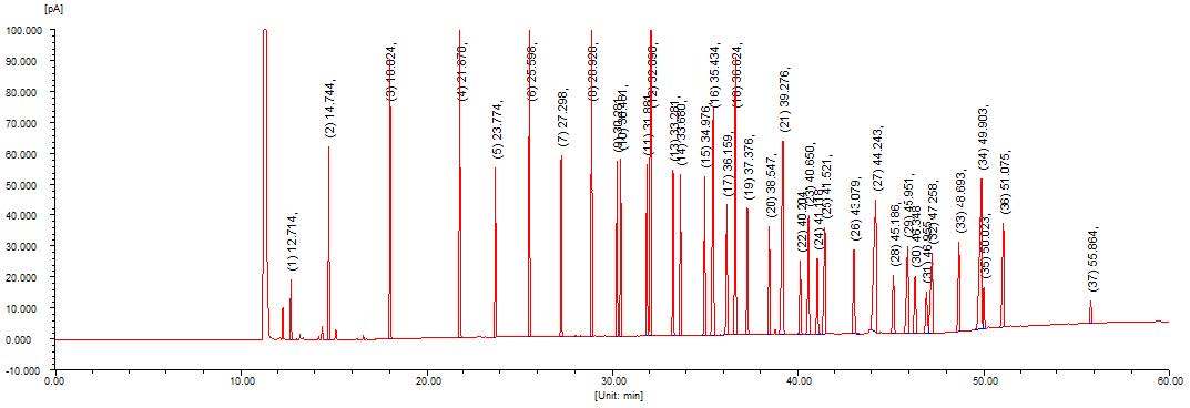 37种脂肪酸甲酯混标在色谱柱(SerialNo:325411D08)上的分离谱图及数据
