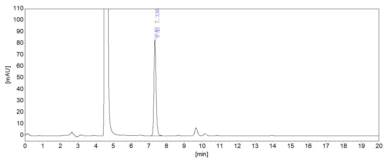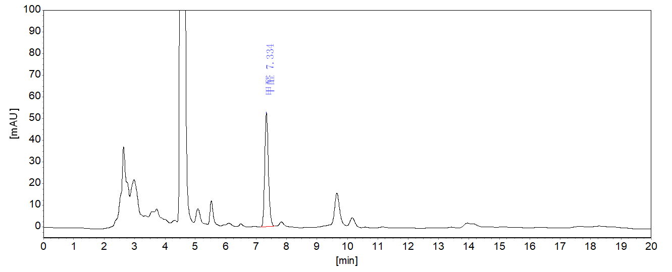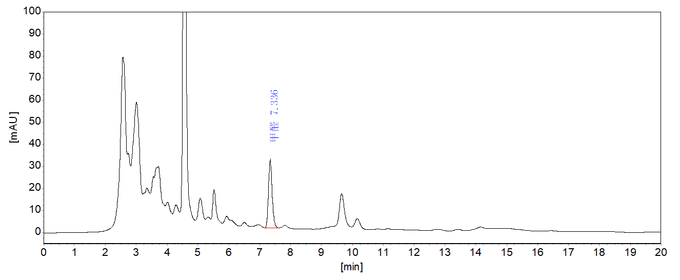 试样用衍生液提取其中的甲醛,反应生成甲醛衍生物,经反相液相色谱分离,紫外检测器检测,根据色谱峰的保留时间定性,面积外标法定量。