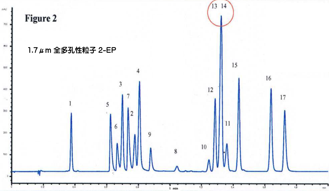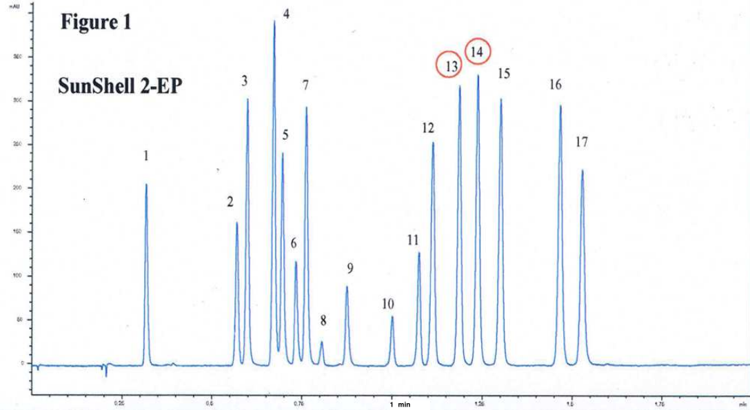 17种化学药品混合物的分离—超临界流体色谱法(SunShell 2-EP与他品牌色谱柱分离效果对比)
