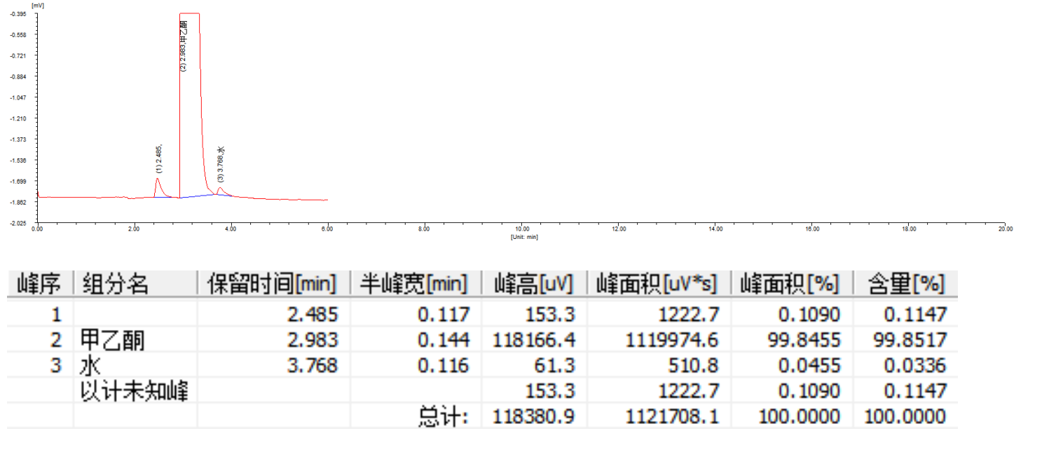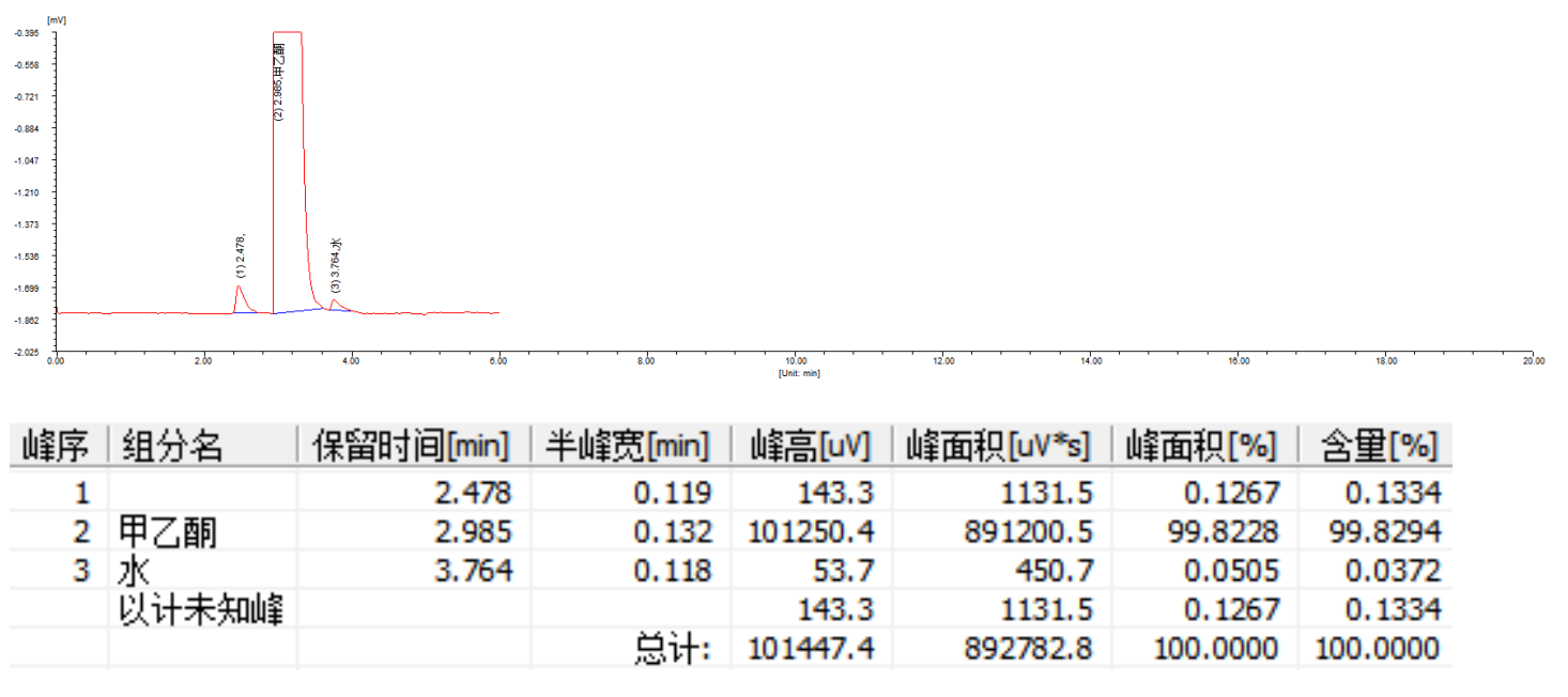 甲乙酮样品的分离谱图及三针检测数据