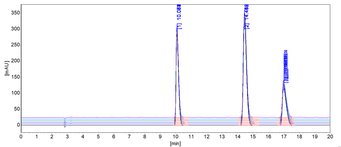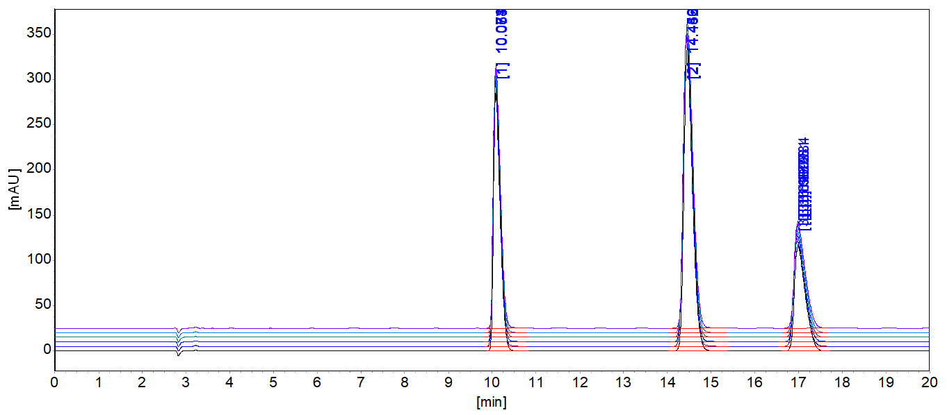 苯甲酸、山梨酸和糖精钠第三级标准溶液六针重复性谱图