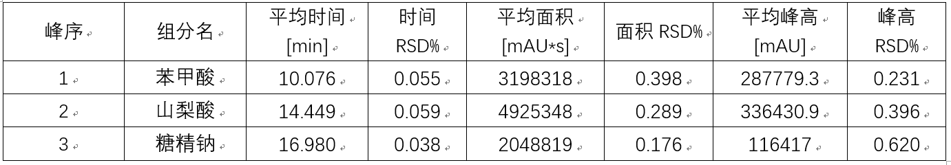苯甲酸、山梨酸和糖精钠第三级标准溶液六针重复性谱图及结果