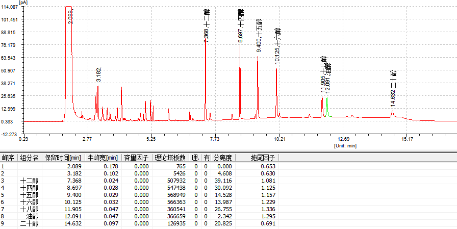 系统适用性溶液:十二醇、十四醇、十五醇、十六醇、十八醇、油醇与二十醇